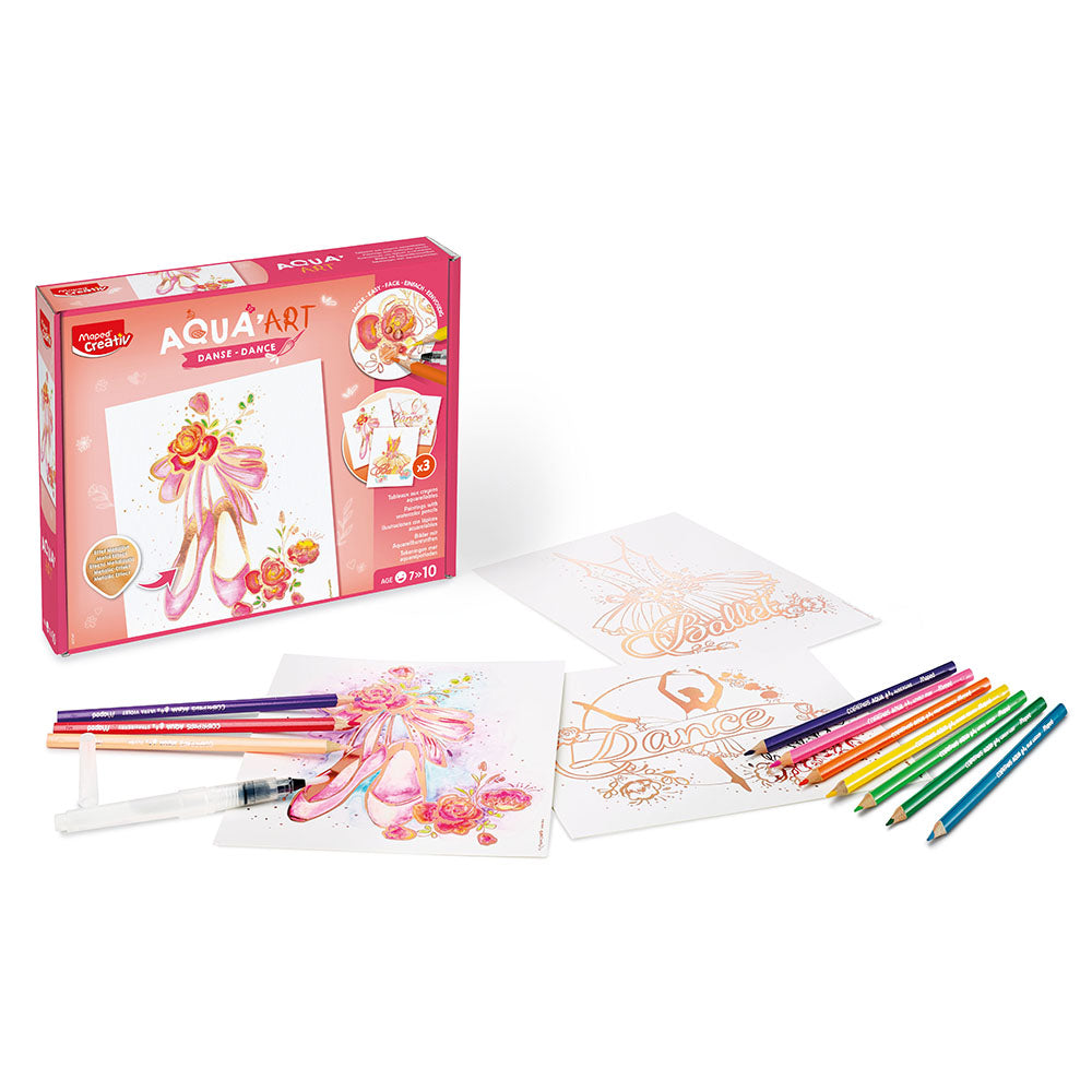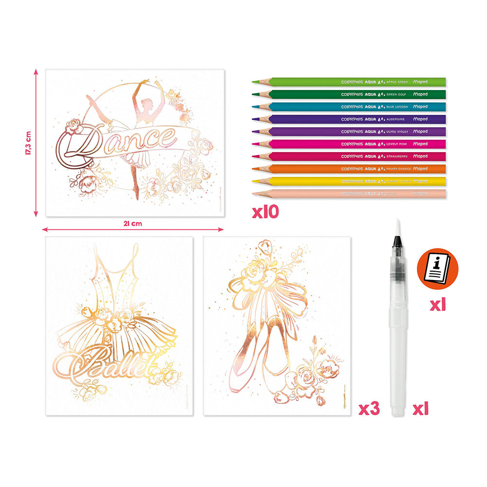 CONTENUTO DELLA CONFEZIONE: Questo kit permette di creare 3 poster sul tema della danza classica. Contiene 3 fogli illustrati e metallizzati con una texture simile alla carta da disegno (750 g/m²), 10 matite acquerellabili che offrono una tavolozza di colori tenui e 1 pennello con serbatoio d'acqua. La scatola di cartone permette di conservare il contenuto dopo l'uso.